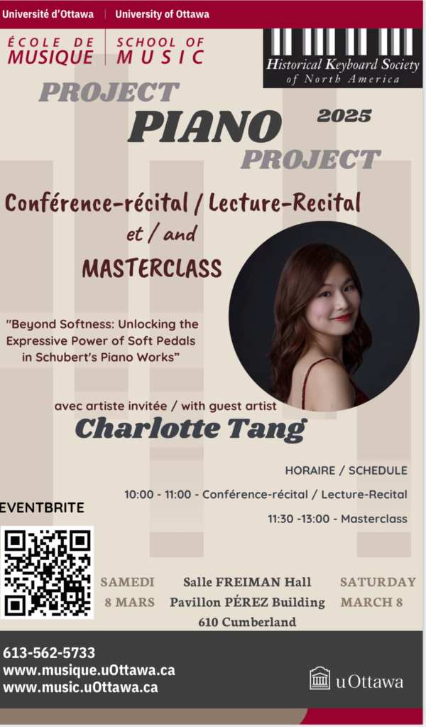 Charlotte Tang is a pianist/fortepianist specializing in early nineteenth-century repertoire and historical keyboard instruments. A laureate of the 2024 Musica Antiqua Competition in Bruges and winner of the 2025 Emerging Artist Competition of Early Music America, she has been praised by La Libre Belgique as an “expressive, fine chamber musician.” Her performances have been heard across North America and Europe, including appearances at the Banff Centre, Saxon Shore Early Music Festival, and leading historical-keyboard venues and institutions.